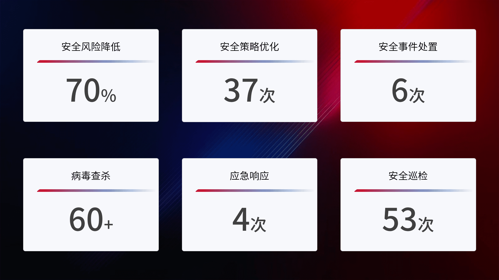 提供全面的安全事件报告体系,,,包括处置报告、、、周报、、、、季度和年度总结,,,,结合持续监控,,帮助客户深入了解网络安全状况。。。
